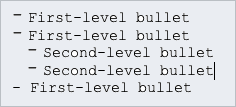 A bulleted list is created using a dash (-) at the beginning of each item. This renders with a filled circle as the bullet. You can also create second-level bullets by simply tabbing in and then using a dash. Second-level bullets render with an open circle for the bullets.
