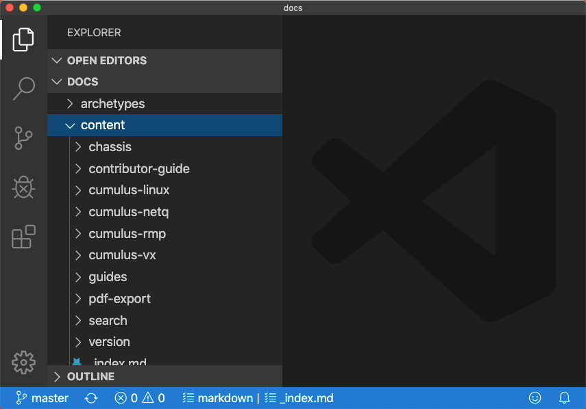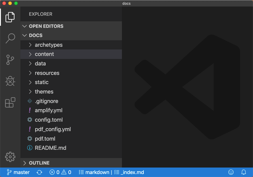 You can view the documentation site structure through your file manager or through a text-based editor. We use VS Code to develop the documentation, but you may use any text editor of your choice.