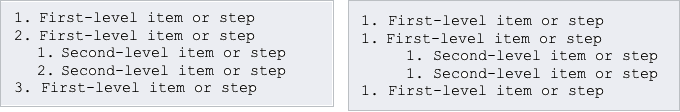 A numbered list is created using numbers at the beginning of each item. You can increase your numbering or always use one (1). You can create second-level items by simply tabbing in and then using the one. First-level items render as 1, 2, 3, and so forth. Second-level items render as a, b, c, and so forth.