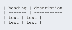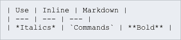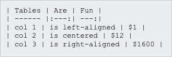Creating tables in Markdown is very easy. Use three or more hyphens (—) to create each column header and pipes (|) to separate each column. While optional, Cumulus uses pipes on either end of a table row as well.