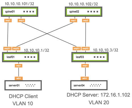 dhcrelayservice so that the configuration persists between reboots:cumulus@leaf01:~$ sudo systemctl enable dhcrelay@default.service cumulus@leaf01:~$ sudo systemctl restart dhcrelay@default.service