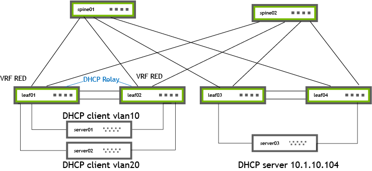 /etc/default/isc-dhcp-relay-REDfile.cumulus@leaf01:mgmt:~$ sudo nano /etc/default/isc-dhcp-relay-RED SERVERS="10.1.10.104" INTF_CMD=" -i vlan10 -i vlan20 -i vlan4024_l3" OPTIONS="" -
