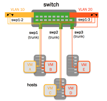 • bridge1 bridges swp1 and swp2, and includes 2 VLANs; vlan 10 and vlan 20