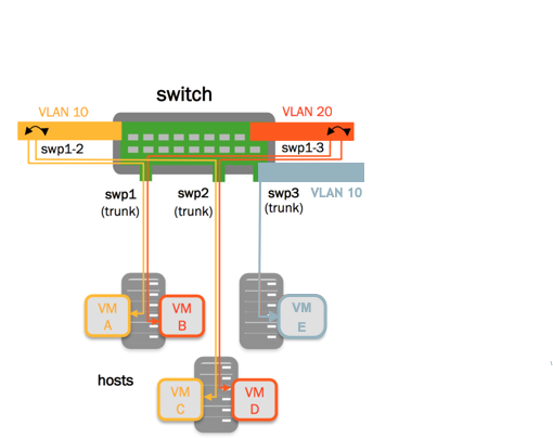 • bridge2 bridges swp3 and contains one VLAN; vlan 10