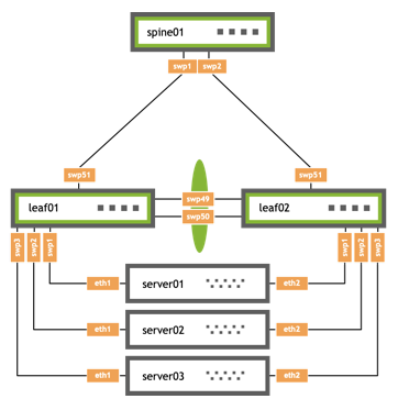 sudo ifreload -acommand to apply all the configuration changes:cumulus@leaf01:~$ sudo ifreload -acumulus@leaf02:~$ sudo nano /etc/network/interfaces ... auto br_default iface br_default bridge-ports bond1 bond2 peerlink bridge-vlan-aware yes ... auto peerlink iface peerlink bond-slaves swp49 swp50auto peerlink.4094 iface peerlink.4094 clagd-backup-ip 10.10.10.1 clagd-peer-ip linklocal clagd-sys-mac 44:38:39:FF:00:AA …