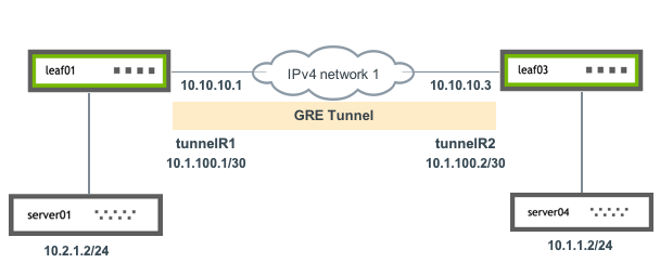 /etc/network /interfacesfile to add the tunnel interface:cumulus@leaf01:~$ sudo nano /etc/network/interfaces ... auto lo iface lo inet loopback address 10.10.10.1/32 auto swp1 iface swp1 address 10.2.1.1/24 auto tunnelR2 iface tunnelR2 address 10.1.100.1/30 tunnel-mode gre tunnel-local 10.10.10.1 tunnel-endpoint 10.10.10.3 tunnel-ttl 255 -