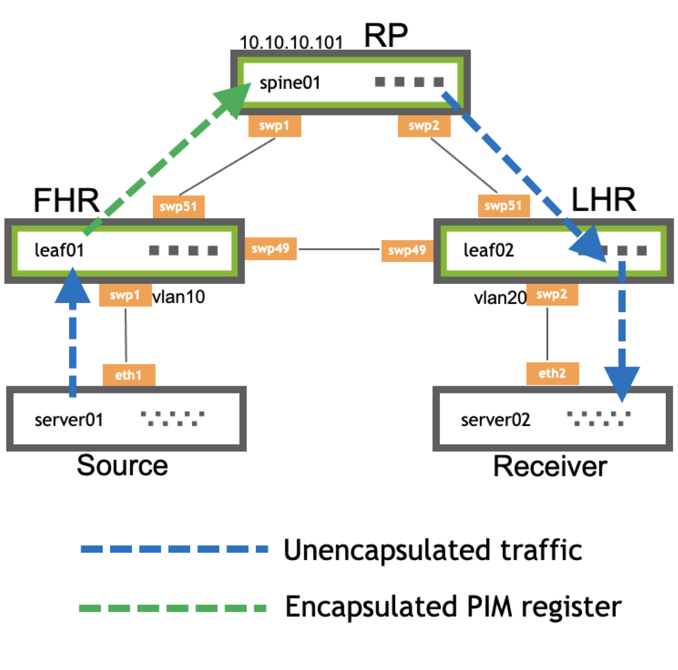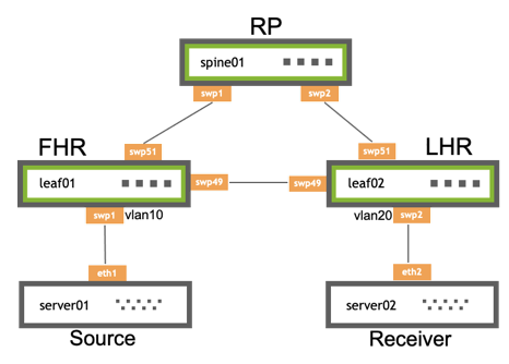 - leaf01 is the FHR, which controls the PIM register process. The FHR is the device to which the multicast sources connect.