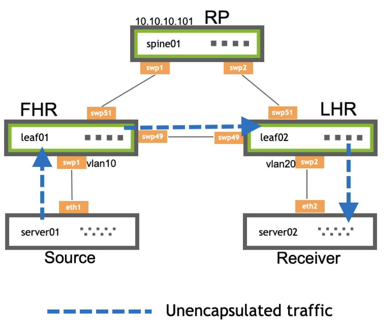 - leaf02 is the LHR, which is the last router in the path and attaches to an interested multicast receiver.