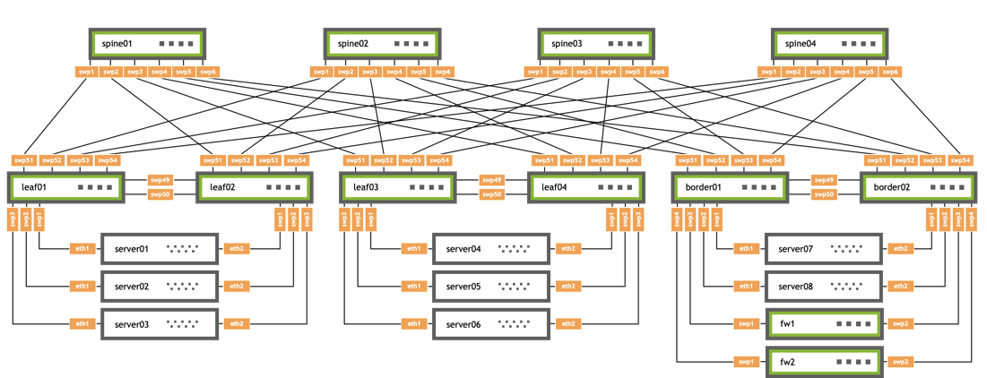 The Cumulus Linux documentation uses this reference topology for configuration examples.