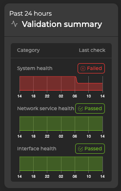 The Validation Summary card displays a summary of validations from the past 24 hours. Select Validation in the header to create or schedule new validation checks, as well as view previous checks.