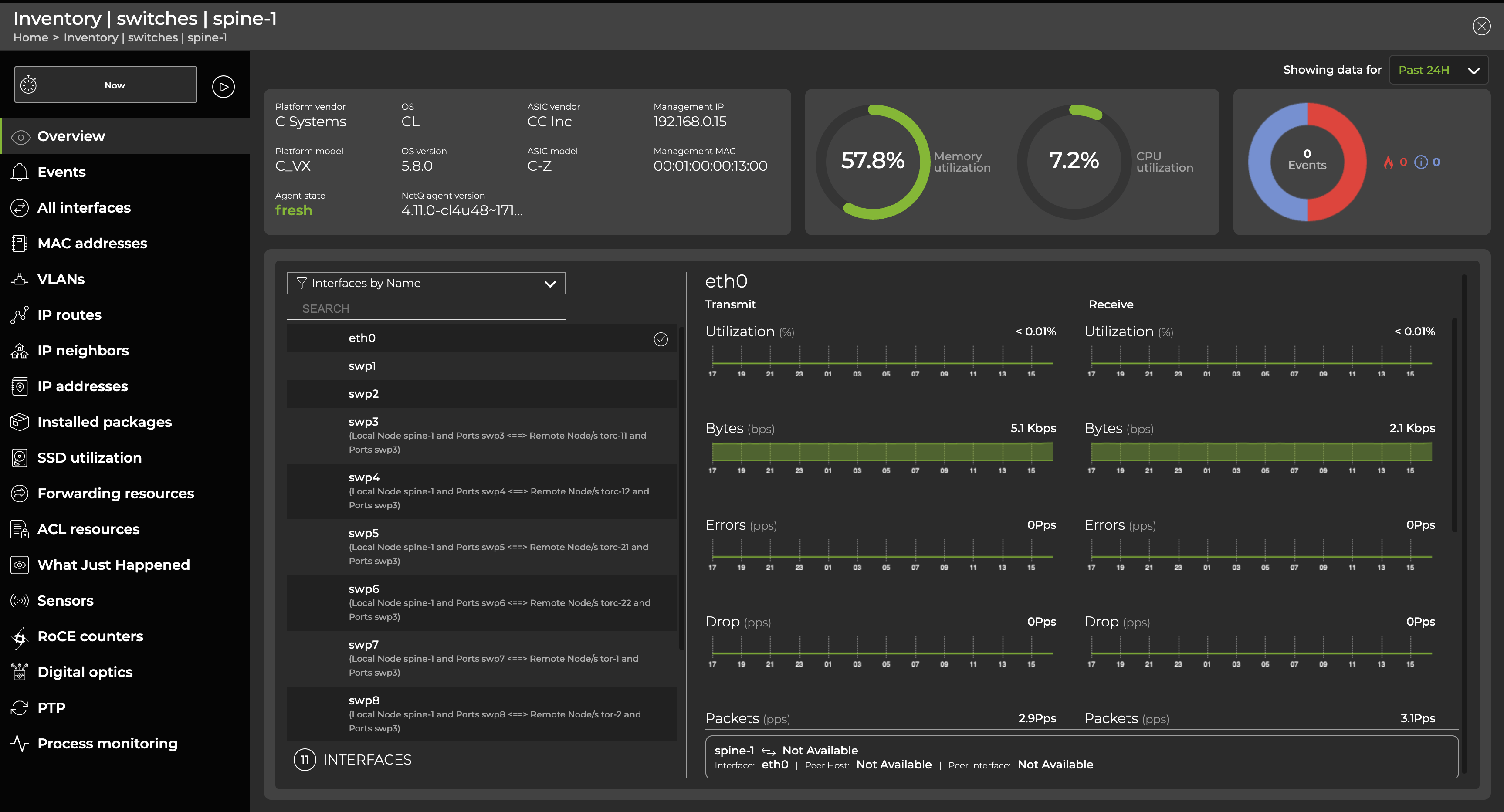 Expand the card to full-screen to view, filter, or export information about events, interfaces, MAC addresses, VLANs, IP routes, IP neighbors, IP addresses, BTRFS utilization, software packages, SSD utilization, forwarding resources, ACL resources, What Just Happened events, sensors, RoCE counters, digital optics, PTP, and process monitoring: