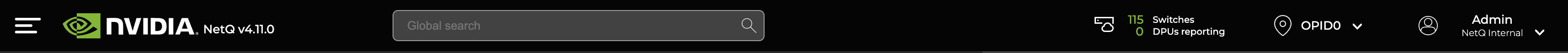 Application Header: Contains the main menu, NetQ version, global search field, count of reachable devices, premises list, and account information.
