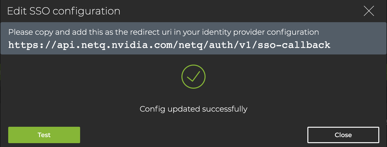 As indicated, copy the redirect URI (https://api.netq.nvidia.com/netq/auth/v1/sso-callback) into your OpenID Connect configuration.