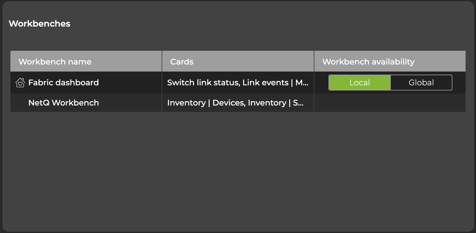 You can also change your home workbench (the workbench that loads when you log in to NetQ) from this view. Select the house to the left of the workbench that you want to set as your home workbench. The next time you log in from this premises, the workbench you selected will be displayed.