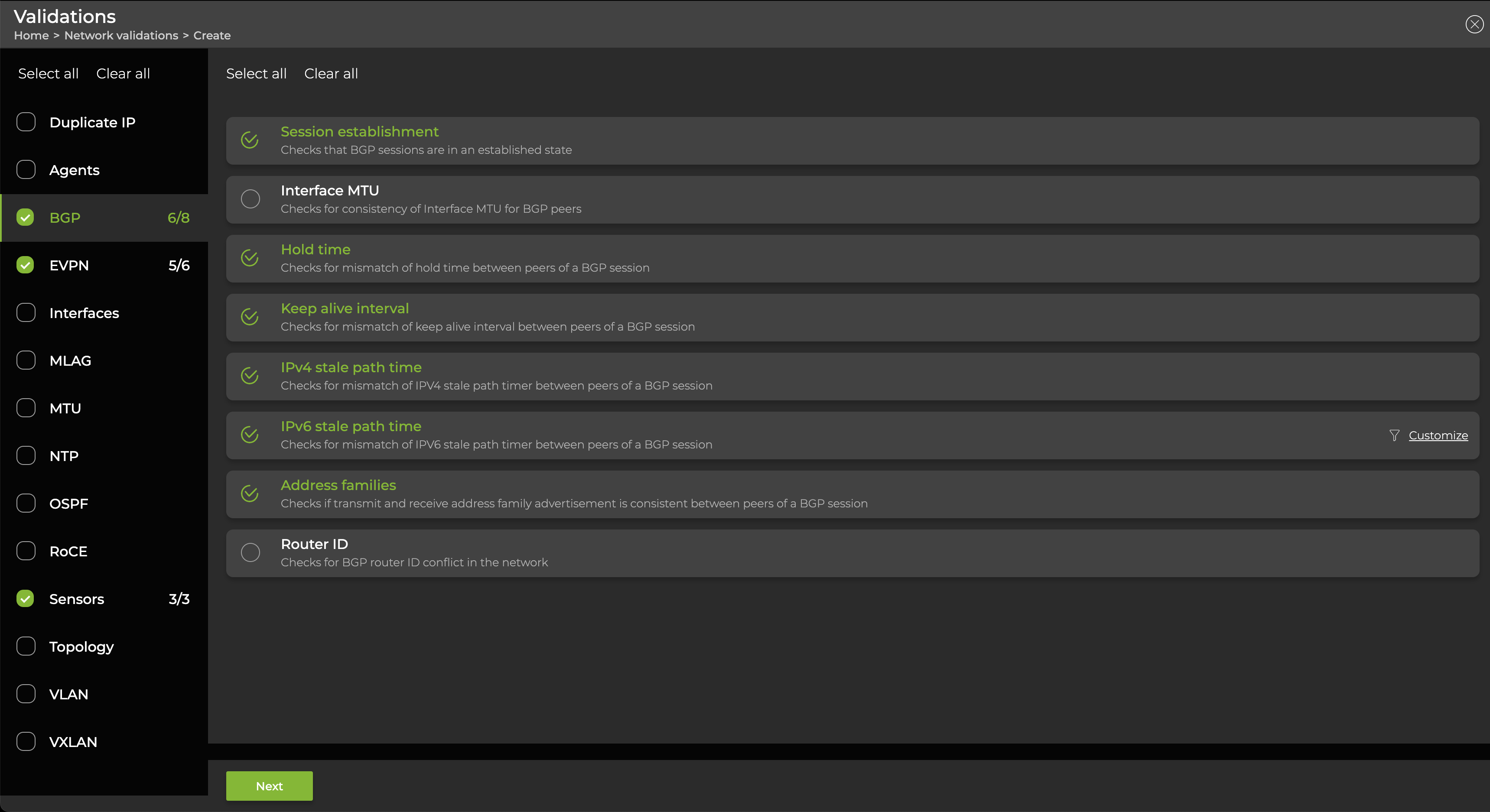 Select the protocols or services you want to include as part of the validation. All tests that comprise the validation are included by default, but you can select an individual test to exclude it from the validation check. Hover over an individual test and select Customize to configure filters which can exclude individual devices or failure reasons from the validation. Then click Next.