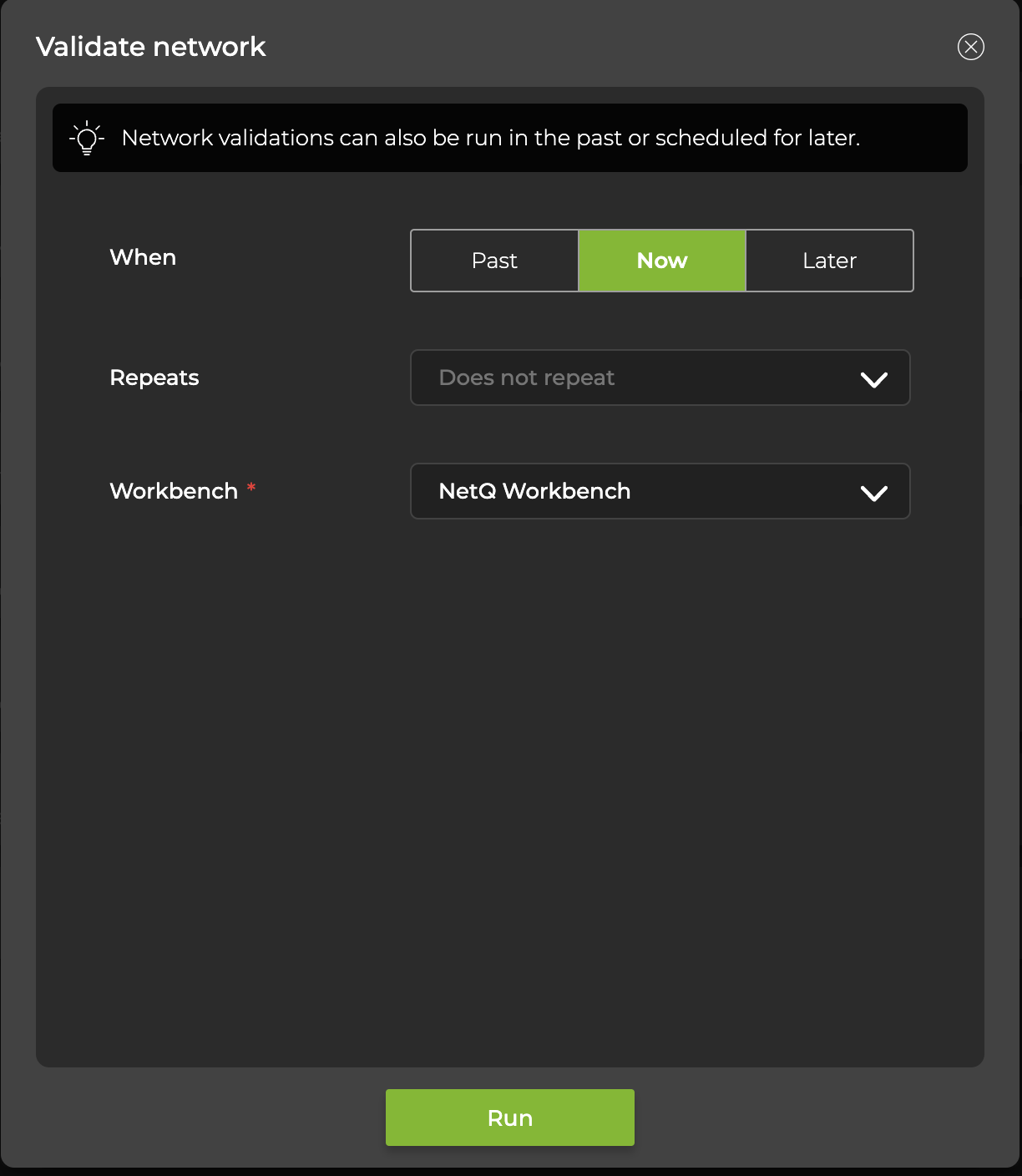 - Select the time and frequency parameters and specify the workbench where the validation results should appear. Then select Run or Schedule.