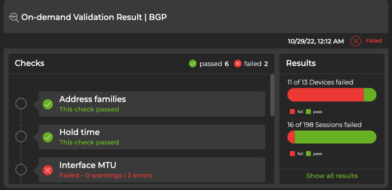 - If you chose to run the validation now, the results are displayed on the workbench you specified in the previous step. If you selected more than one protocol or service, a card opens for each selection. To view additional information about the errors reported, hover over a check and click View details. To view all data for all on-demand validation results for a given protocol, click Show all results.