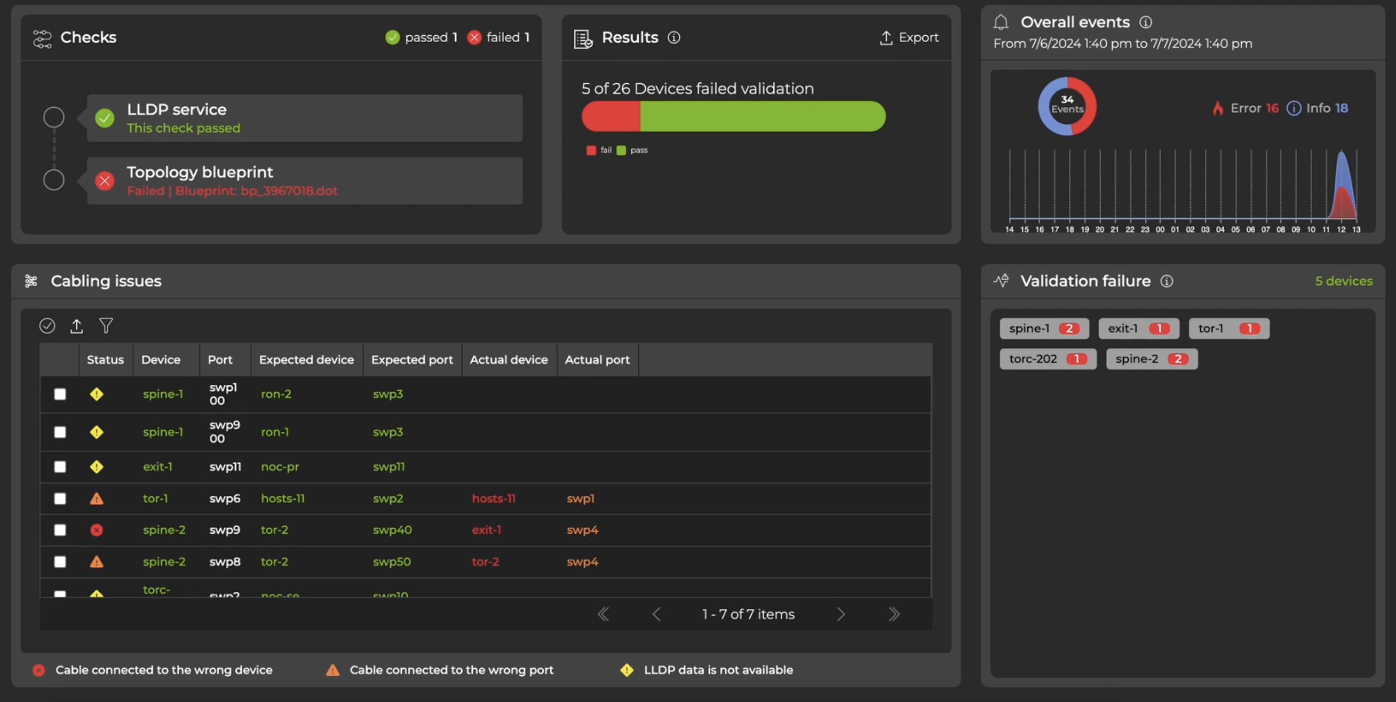 - If you do not configure all of your network devices in the topology blueprint, the total number of devices accounted for in the validation results card might include additional devices that NetQ has received LLDP data from.