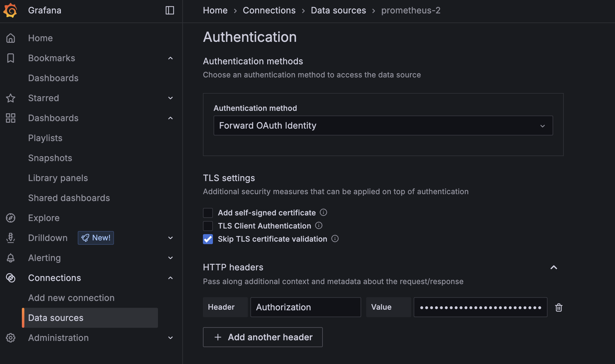 - On the same page, navigate to the Authentication section. In the HTTP headers section, select Add header. In the Header field, enter Authorization. In the Value field, enter the token that you generated in step one of this section.
