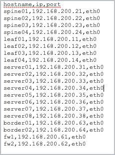 The CSV file must include a header containing hostname, ip, and port. They can be in any order you like, but the data must match that order. For example, a CSV file that represents the Cumulus reference topology could look like this: