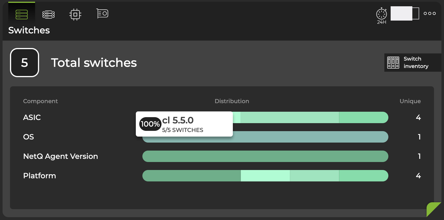 Expand to the large card for additional distribution info. By default, the Switches tab shows the total number of switches, ASIC vendors, OS versions, NetQ Agent versions, and platforms deployed across all your switches. You can hover over and select any of the segments in a component distribution chart to highlight and filter data, including: