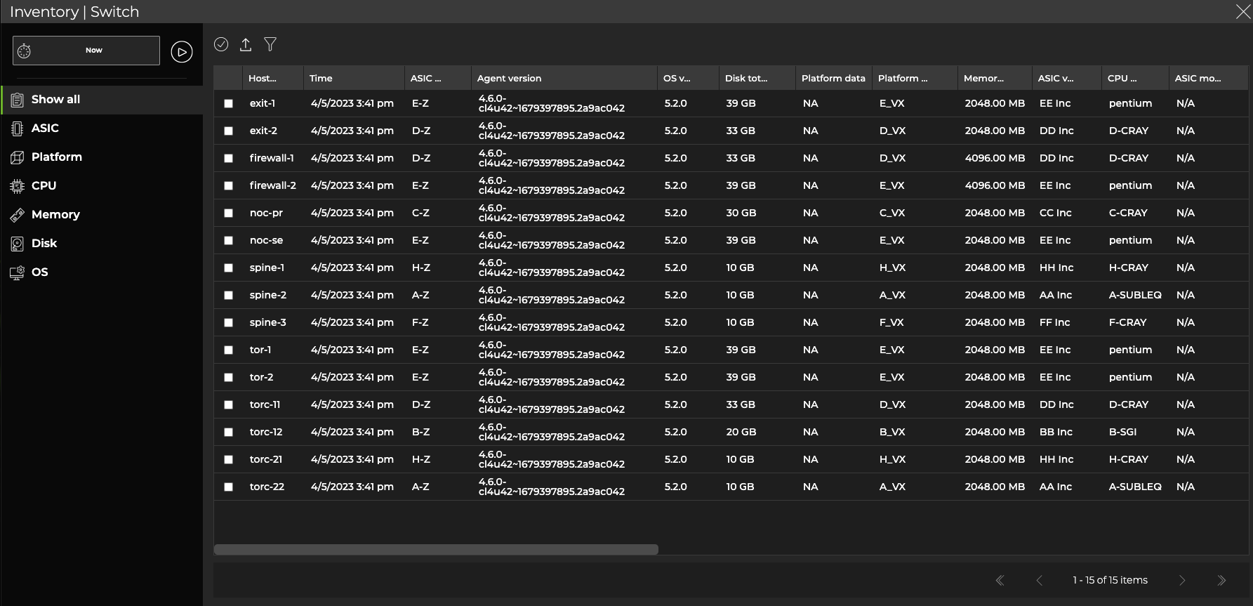 Expand the Inventory/Switches card to full-screen to view, filter or export information about ASICs, motherboards, CPUs, memory, disks, and operating system.