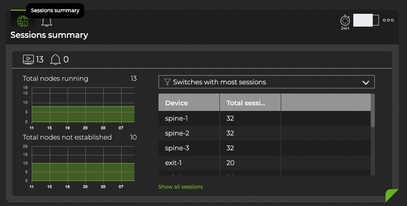 Expand to the large card for additional BGP info. By default, the card displays the Sessions summary tab. From here you can see which devices are handling the most BGP sessions, or select the dropdown to view nodes with the most unestablished BGP sessions. You can view BGP-related events by selecting the Events tab.