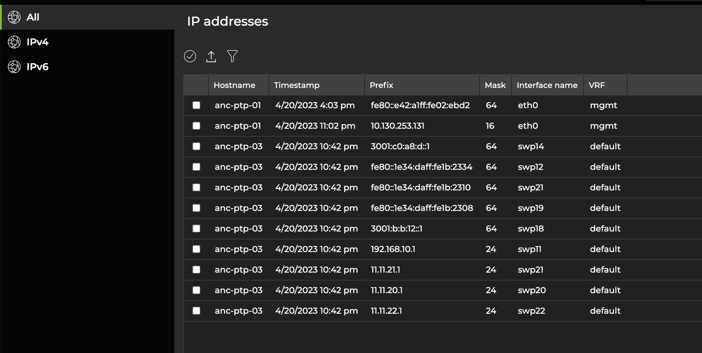 IPv4 and IPv6 address, neighbor, and route information is available in the NetQ UI. To access this information, select the Menu. Then select IP addresses, IP neighbors, or IP routes from the list of options. The following image displays a list of IP addresses: