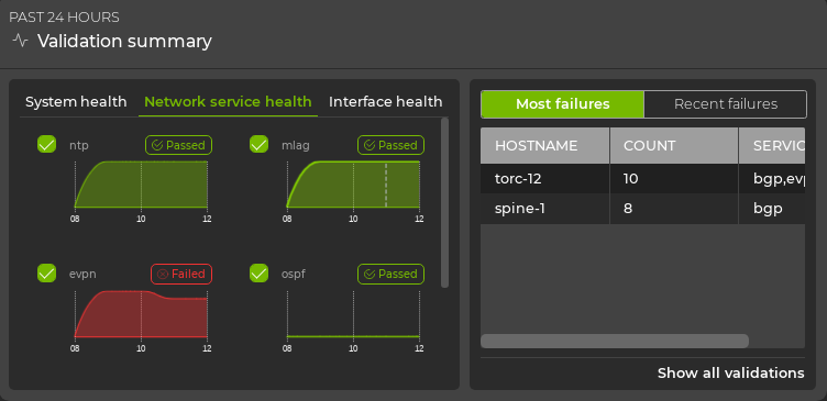 Network service health represents the individual network protocol and services validation checks. In all cases, checks are performed on NTP. If you are running BGP, EVPN, MLAG, OSPF, or VXLAN protocols the validation checks include these as well.