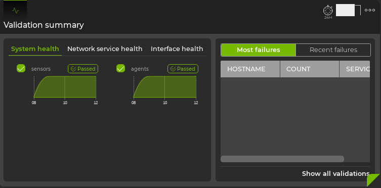 Expand the Validation Summary card to full-screen to view all validation check results for all network protocols and services during a designated time period.