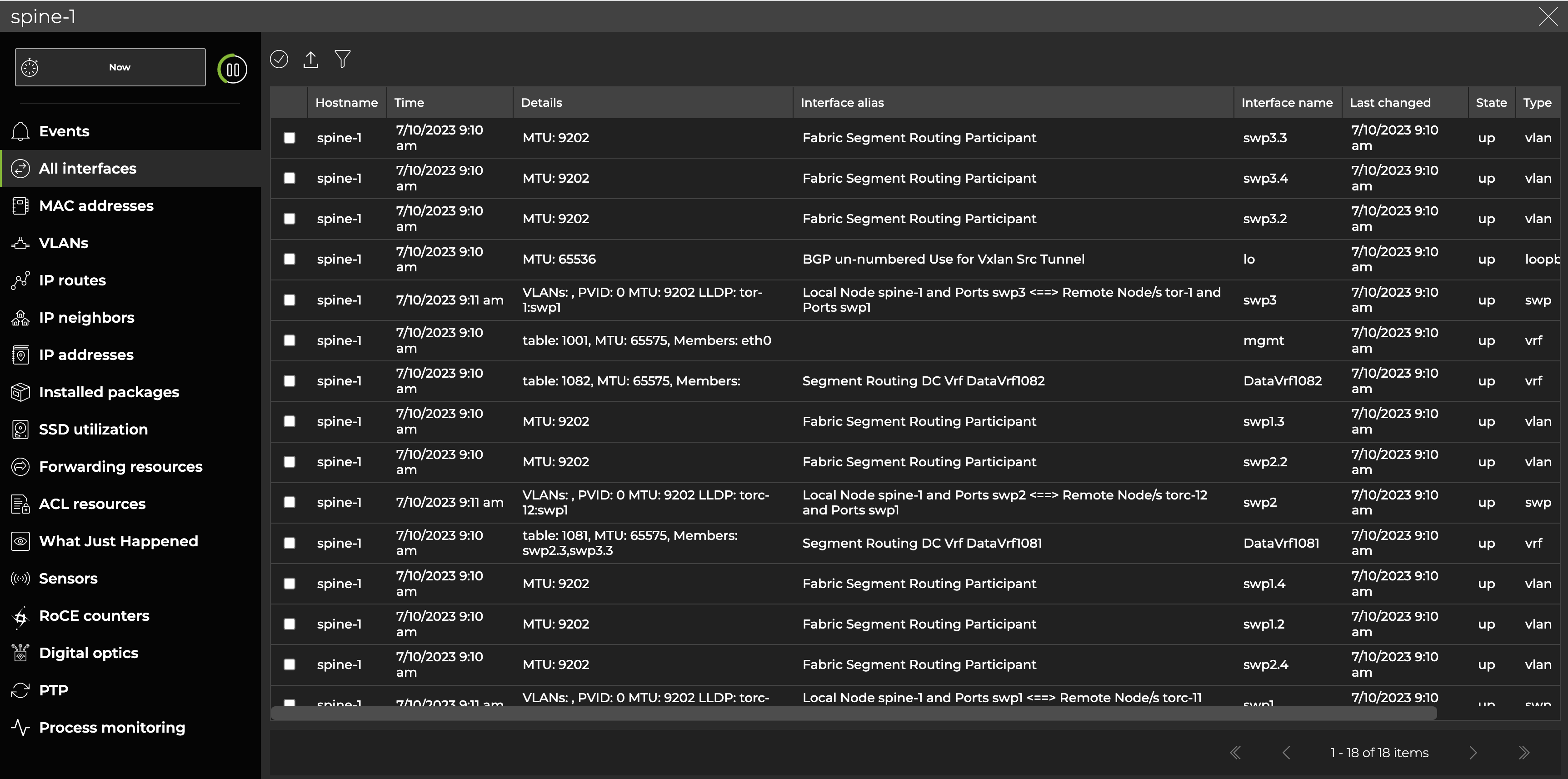 Expand the Switch card to full-screen to view, filter, or export information about events, interfaces, MAC addresses, VLANs, IP routes, IP neighbors, IP addresses, BTRFS utilization, software packages, SSD utilization, forwarding resources, ACL resources, What Just Happened events, sensors, RoCE counters, digital optics, PTP, and process monitoring: