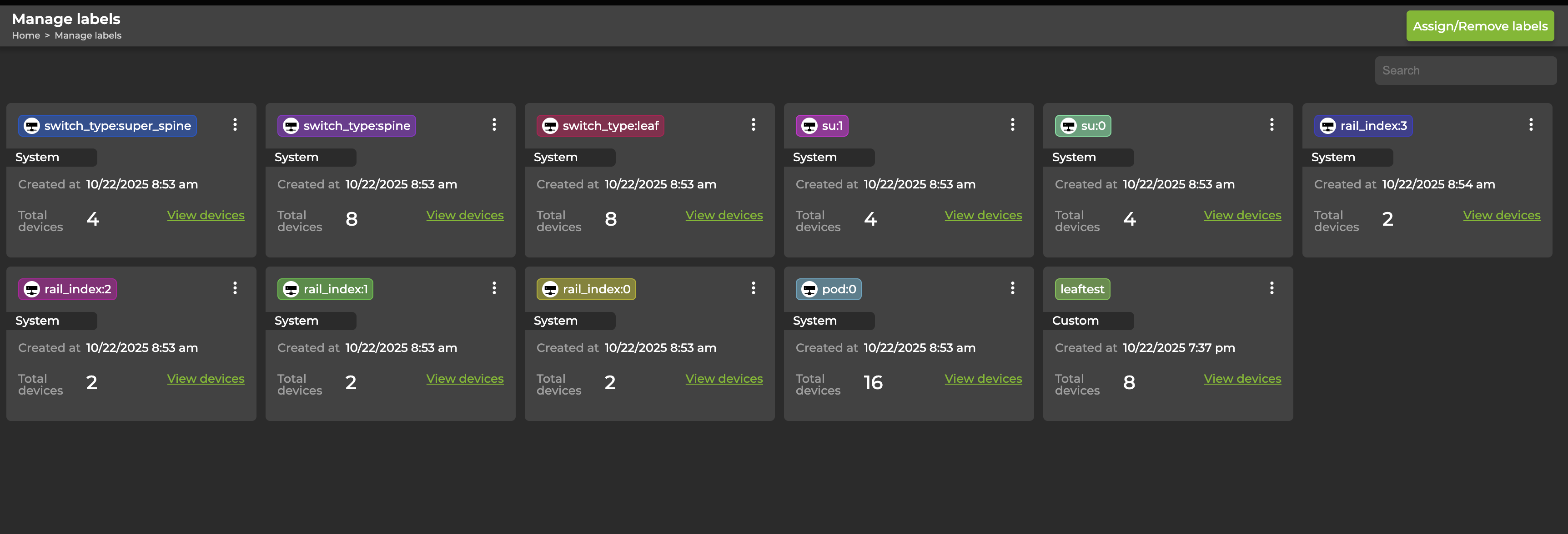 Labels are key-value pairs that you can assign to switches. You can use labels to group, filter, and organize switches. You can also run validations against a set of switches that share a common label. There are two types of labels: system-generated labels and user-generated, or custom, labels.