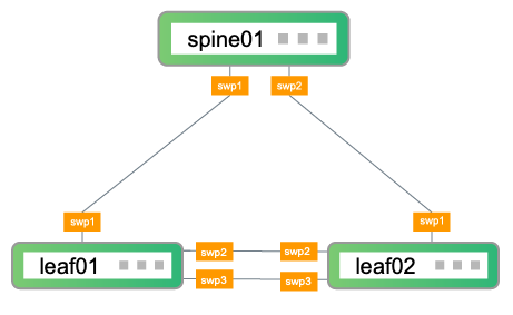 In the topology, leaf01 and leaf02 are the access layer switches on the network. leaf01 and leaf02 connect to spine01, which is the aggregation layer switch on the network. To facilitate additional configuration after the initial setup descibed in this guide, leaf01 and leaf02 also have two connections to each other.