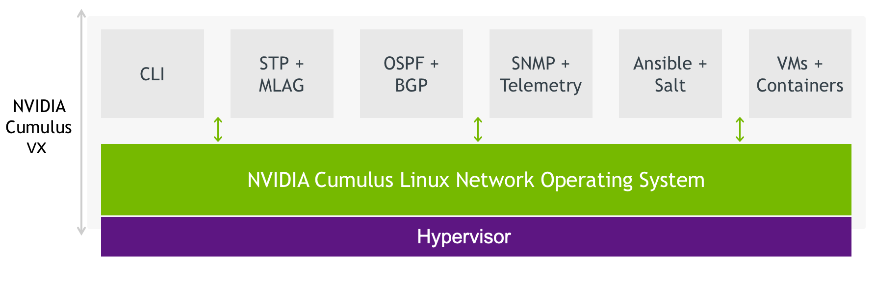 Cumulus VX is a virtual machine (VM) on a standard x86 environment. The VM is the same Cumulus Linux operating system supported on NVIDIA ethernet switches and contains the same software features but in a VM format. Cumulus VX provides full data plane functionality through the Linux kernel, as well as layer 2 VLAN, VXLAN bridging, and VXLAN routing capabilities.