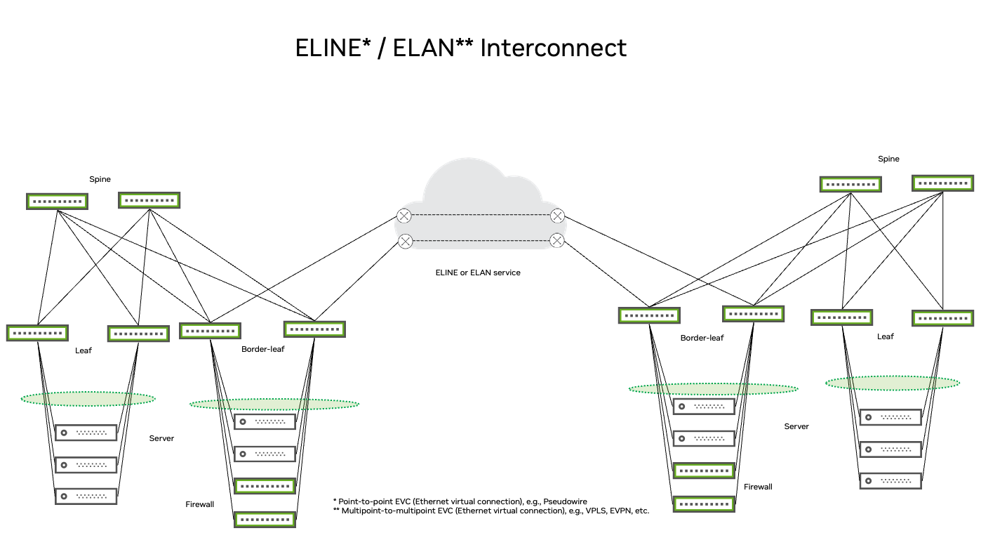 The example below shows a point-to-point EVC or multipoint-to-multipoint EVC service provided by a third party. These services are called ELINE and ELAN. An example of an ELINE service is a pseudowire with an emulated end-to-end Ethernet service over multiprotocol label switching (MPLS). An example of an ELAN service is a virtual private LAN service (VPLS). Although it helps to know how these services work and what limitations they have, jumbo-frame support remains the most important consideration when choosing between third-party vendors.