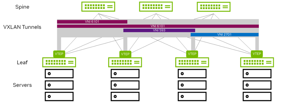 These are the top-of-rack switches (for bare-metal endpoints) and server hypervisors (for virtualized workloads). A VTEP requires an IP address (often a loopback address) and uses this address as the source/destination tunnel IP address. The VTEP IP address must be advertised into the routed domain so the VXLAN tunnel endpoints can reach each other. You can have multiple VNIs (VXLANs) using one VTEP IP address. Each switch that hosts a VTEP must have a VXLAN-supported chipset, such as Spectrum. VXLAN is a point-to-multipoint tunnel. Multicast or broadcast packets can be sent from a single VTEP to multiple VTEPs in the network.