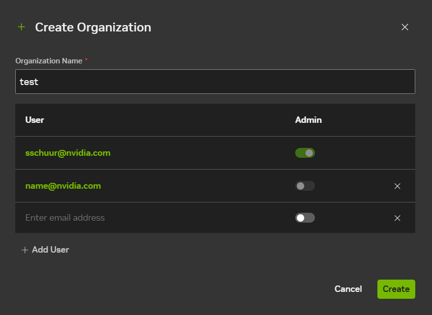 - Enter the email addresses of the users you want to add to the organization. You can select the Admin toggle to grant users additional privileges, such as adding additional users.