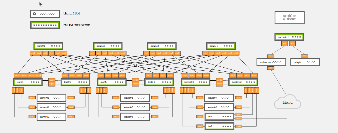 - One Cumulus Linux out-of-band management switch (oob-switch)